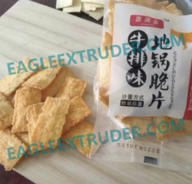 地鍋脆片膨化機主要以玉米粉,面粉為原料利用的擠壓成型工藝,生產市場行的鍋巴膨化食品。該機械生產線設計合理,自動化程度高,擠壓參數控制,主機配有高低壓螺桿,增加了原材料的使用范圍,降低了成本,改善了產品 的品質。該生產線可以通過更換成型機,能夠生產不同類型的鍋巴,如平口鍋巴、鋸齒鍋巴,還有單層鍋巴、復合鍋巴,尺寸大小也可以通過更換模具實現產品。該產品具有形狀新穎、口感、營養豐富、組織細膩之特點,適合的市場需求,滿足人們日新月異的舌尖需求。