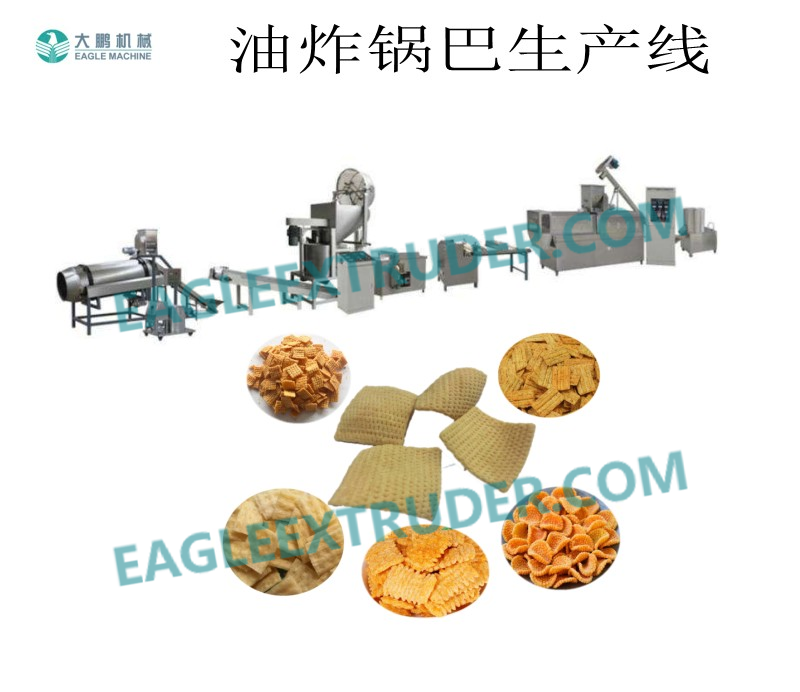 一、黃豆脆鍋巴設備工藝流程: 原料配制→攪拌→輸送→擠壓膨化→(壓花)切斷→輸送→油炸→噴油→調味→冷卻→(包裝)